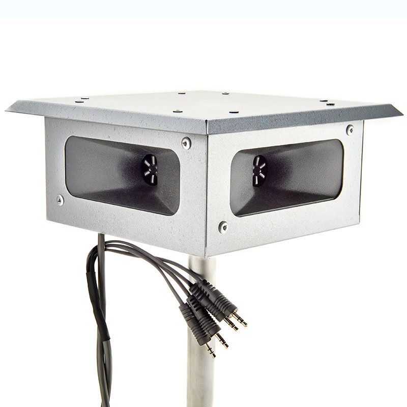Crop Gard uses non-natural sounds which Birds have not heard before, and actual Bird distress, alarm and predator calls. The Crop Gard has 4 speaker output terminals that can be connected directly to a 4 way (360 degree) speaker and in some situations can also be used to run a sonic fence (a series of speakers 30m apart). The sonic fence as it is known, is made up of as many as 8 speakers forming a wall of sound 200m long.